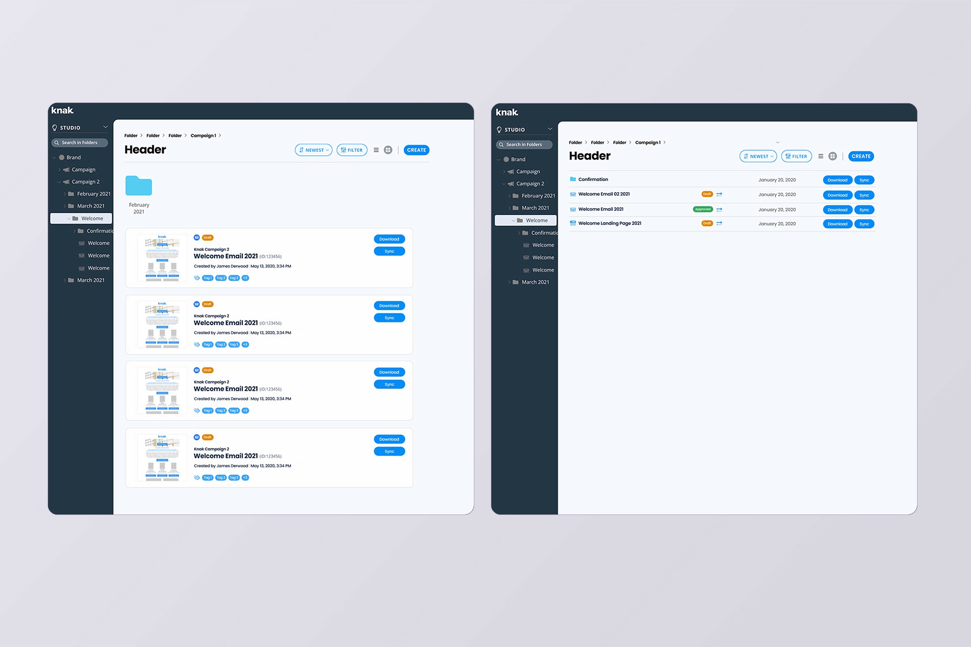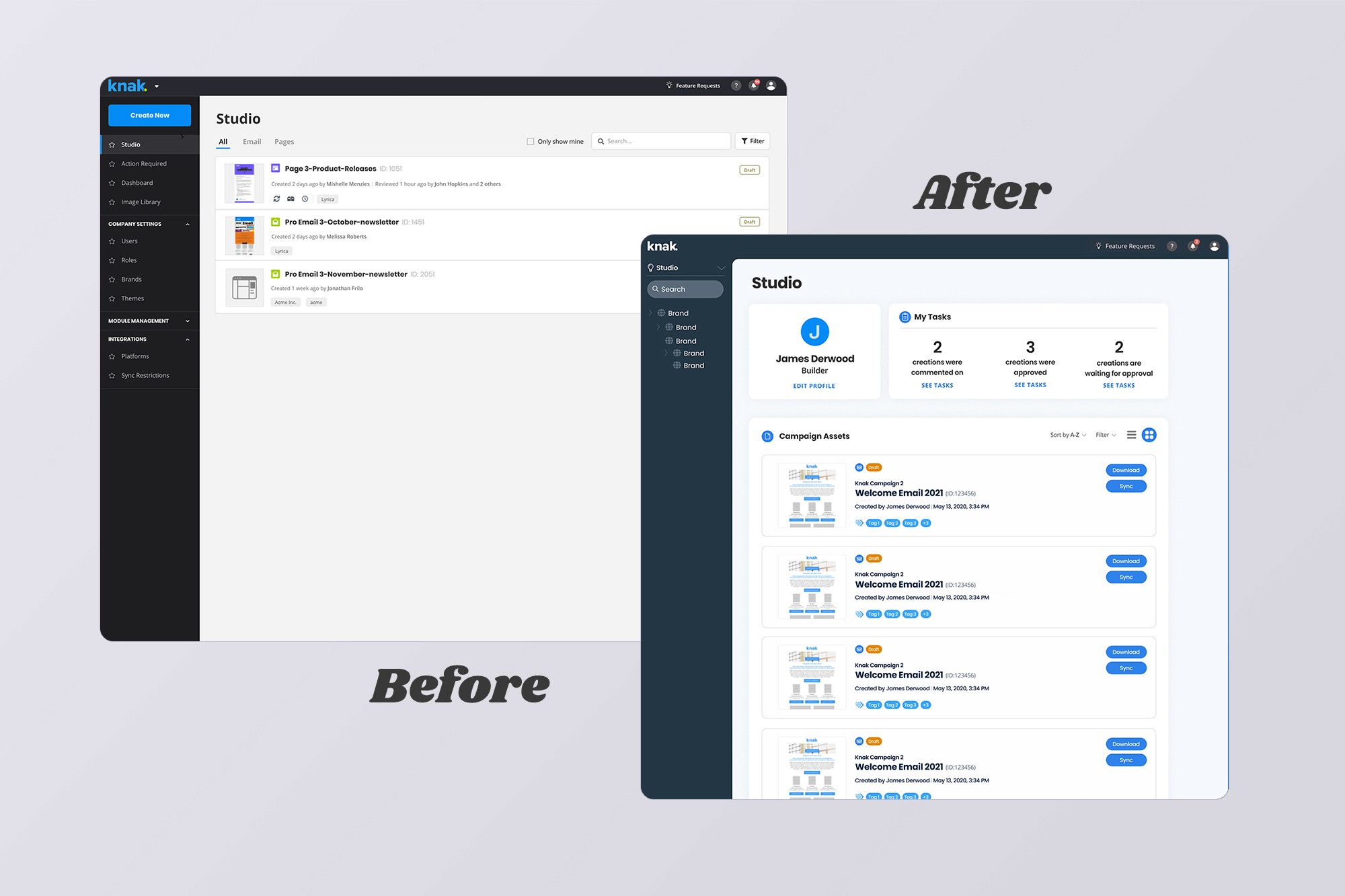 Knak is a no-code email and landing page builder for enterprise marketing teams. It integrates with Marketing Automation Platforms (MAPs), allowing marketers to create campaign assets and sync them directly without developer support. As users managed more campaigns and assets, organizing and finding content became a critical workflow challenge.