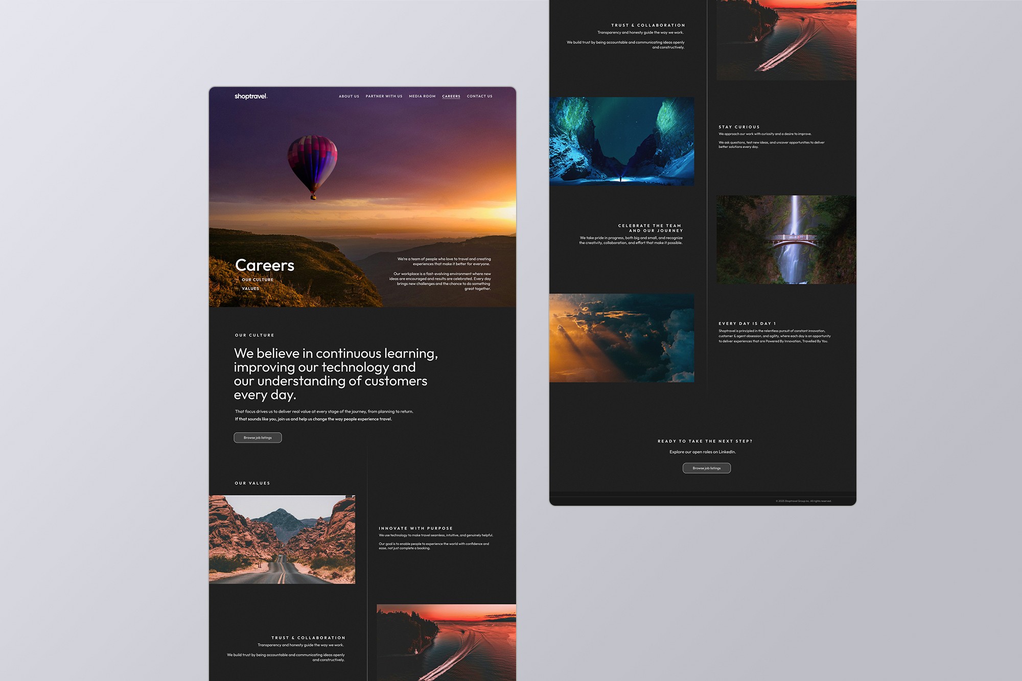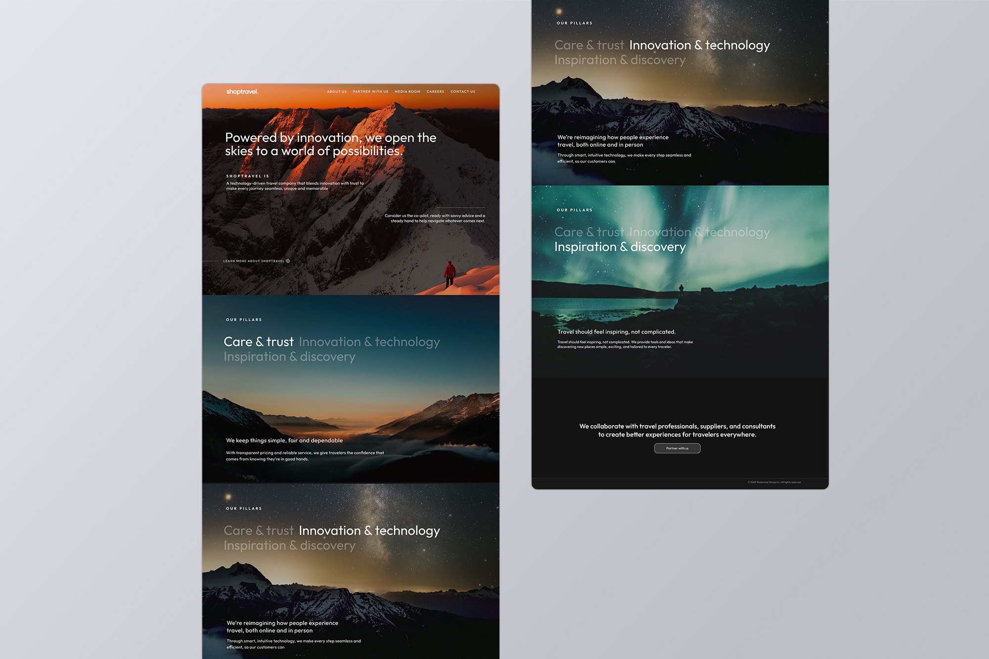 Shoptravel is an online travel agency that needed a corporate website reflecting what they're really about: the wonder of travel. We wanted to capture that feeling of wanderlust, not just inform but inspire partners and potential employees about who this company is.